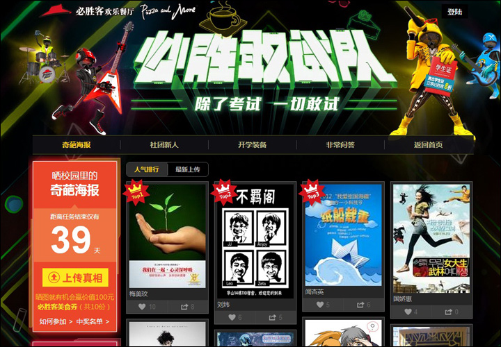核心提示:必勝客敢試隊(duì)除了考試,一切敢試!曬校園里的奇葩海報(bào),曬社團(tuán)新人照片(萌帥呆囧),曬開學(xué)裝備,曬個(gè)人學(xué)生證,在這里沒有你想不到的,只有你不敢試的。參加活動(dòng),便有機(jī)會(huì)獲得必勝客美食券,鼓起勇氣,召喚小伙伴一起來(lái)試吧! Project: 必勝客敢試隊(duì) 人人網(wǎng)
