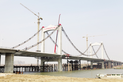 昨天上午,記者登上大慶路淮河公路橋主橋面時,熱鬧的施工現(xiàn)場與寒冷的天氣形成了鮮明的對比。大橋最南端的接線上,幾臺機器正在攤鋪最后一層瀝青。大慶路淮河公路橋建設(shè)指揮部技術(shù)質(zhì)量部部長薛峰告訴記者,橋面瀝青一天之內(nèi)就能鋪好。“瀝青是最后一道主要工序,完成后就標(biāo)志大橋主體大功告成了。”
